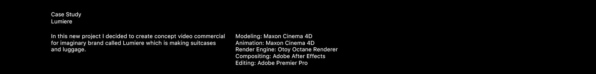 In this new project I decided to create concept video commercial for imaginary brand called Lumiere which is making suitcases and luggage.
